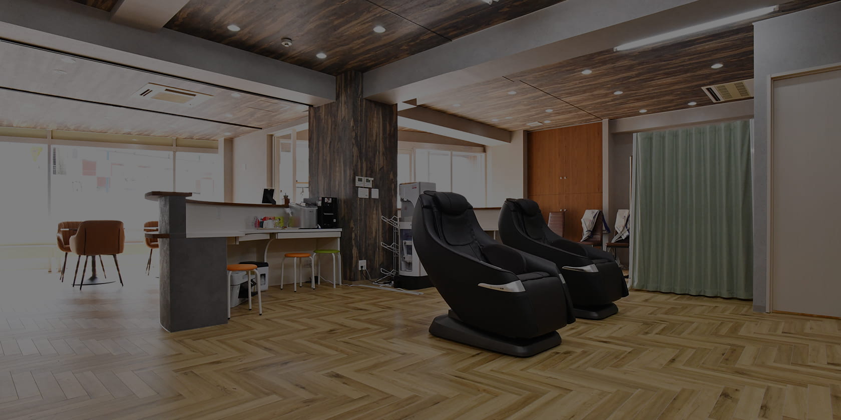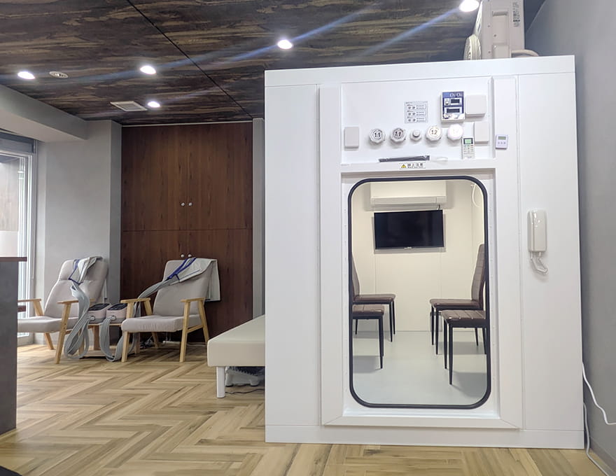 リラクゼーションコーナーの大きな魅力は、酸素カプセルです。快適な空間で酸素を取り入れることで、疲労回復や気分のリフレッシュを促し、深い安らぎを体感していただけます。さらに、全身をほぐすマッサージチェアや、脚や足裏をケアする機器もご用意しており、心身ともにリラックスできる環境を整えています。日常を離れ、ゆったりとした癒しのひとときをお過ごしください。